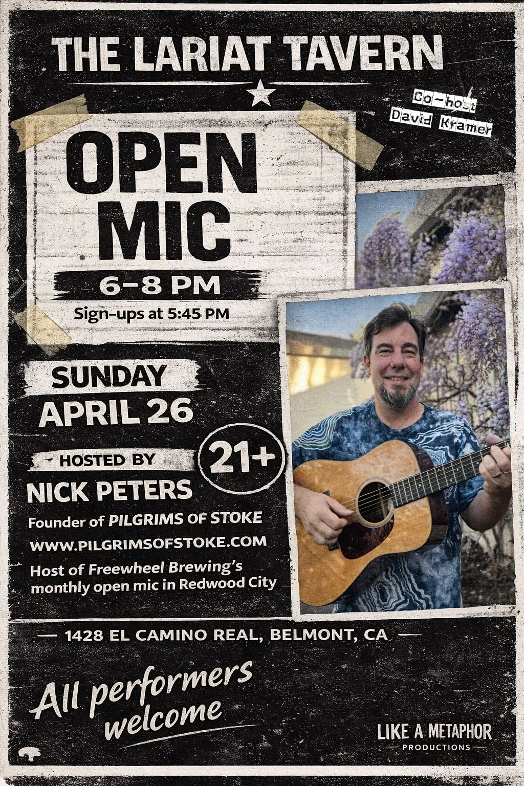 Sunday, April 26, 2026 Nick Peters Co-Host David Kramer Open Mic The Lariat Tavern, Belmont , 21+ 1428 El Camino Real, Belmont